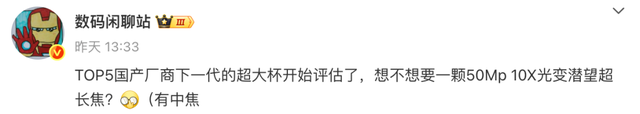 爆料提到已经有 TOP5 国内厂商开始评估下一代超大杯,还暗示其中有一颗 5000 万像素的 10 倍潜望长焦。